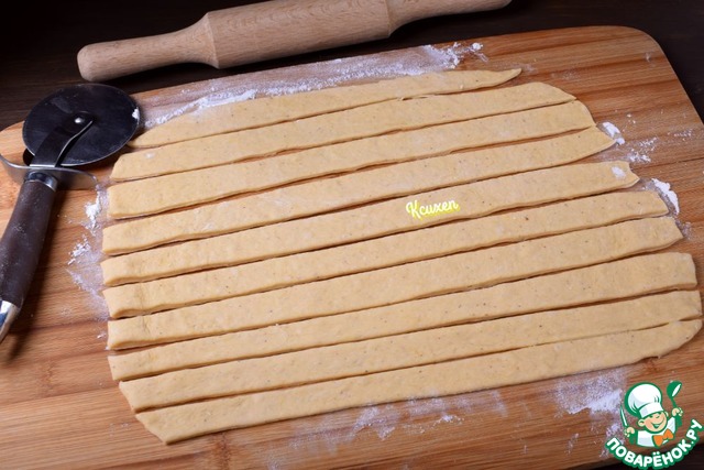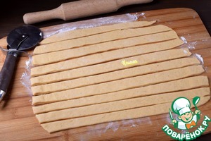Пользуясь небольшим количеством муки, раскатаем тесто скалкой в тонкий пласт и нарежем его на полоски шириной 2-3 см.