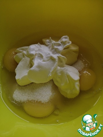 Яйца, сахар, размягченное сливочное масло и сметану взбить хорошо миксером. Добавить ванилин и снова взбить.