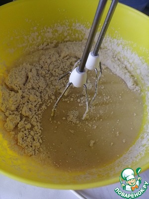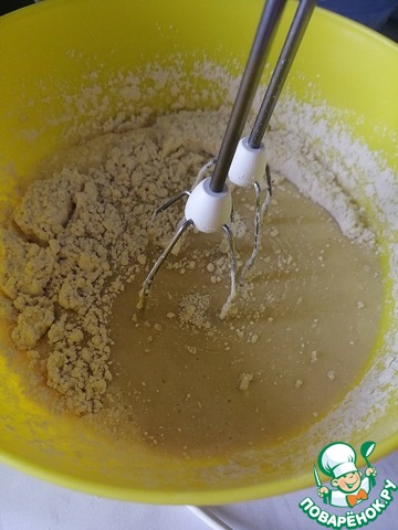 Добавляем к яичной смеси просеянную муку и снова взбиваем минут 5.