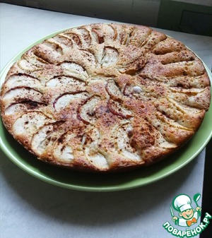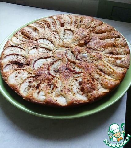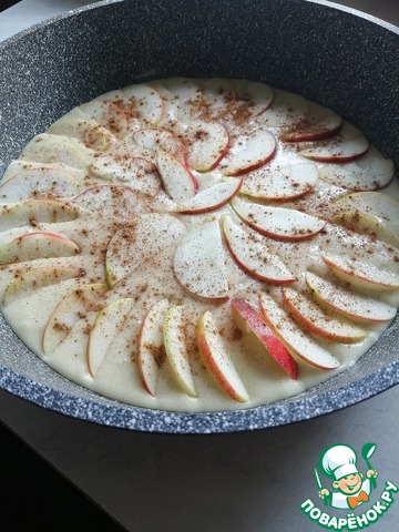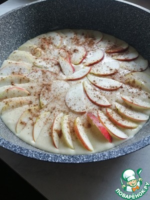 Готовое тесто выливаем в смазанную сливочным маслом форму. Яблоки очищаем от семечек и нарезаем, затем выкладываем на тесто. Сверху посыпаем яблоки сахаром и корицей и ставим в духовку при 200 градусах на 40 минут.