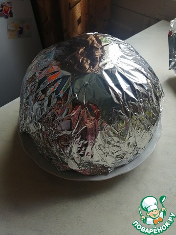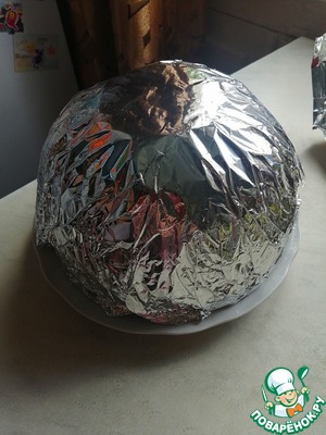 Миску переворачиваем дном вверх и обматываем фольгой, затем смазываем по всей фольге маслом сливочным чтобы не прилипало.