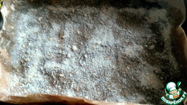 Форму 17 на 24 см застелить промасленным пергаментом и посыпать сухарями.
