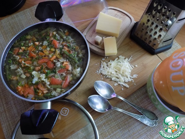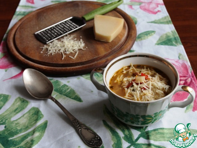 Для подачи нужно положить в тарелку с минестроне Пармезан, натёртый на тёрке. Именно Пармезан идёт в этот суп. Конечно, за неимением его, можно использовать другой сыр твёрдый, вами любимый.