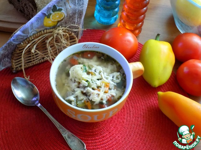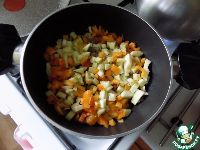 Выкладываем морковь, порезанную мелким кубиком. Накрываем крышкой и томим минут 5 на среднем огне. Далее-мелкие кусочки кабачка и болгарского перца. Опять томим минут 5. Нам не нужно овощи делать разваренными. В этом супе они должны быть в состоянии аль-денте (на зубок).