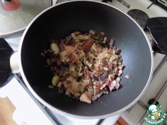 Так как у нас рецепт итальянской кухни, берём для его приготовления оливковое масло и не будем его замещать никаким другим! Для приготовления этого супа, я возьму кастрюлю с толстым дном, в которой буду обжаривать овощи и бекон и далее варить минестроне. Наливаем 1 ст л масла, греем его и выкладываем чеснок раздавленный. Обжариваем его с минуту, он отдаст аромат свой маслу. Его можно убрать. Далее-порезанный лук, обжариваем ещё до мягкости, добавляем специи: базилик, тимьян, розмарин. Можно взять готовый набор итальянских трав. Выкладываем порезанный бекон. Обжариваем совсем немного.