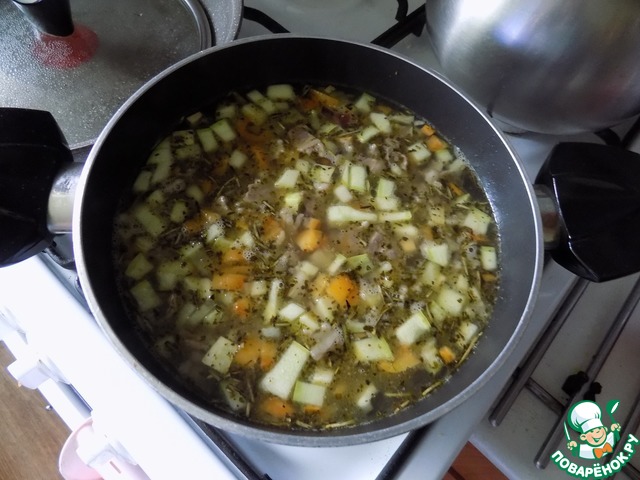 Наливаем горячую воду. Нужно, чтобы воды было примерно на 5 см выше овощей. Доводим до кипения, убавляем огонь на минимум, накрываем крышкой и варим суп минут 10.