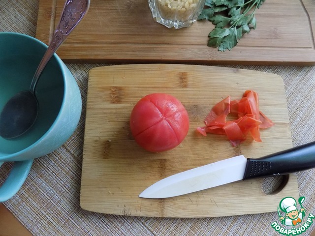 Тем временем с помидора снимаем кожицу. Помидор нужно надсечь крест на крест и опустить на минуту в кипяток. Кожица легко снимется.