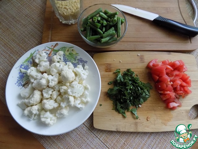 Нам ещё в суп нужно положить цветную капусту, фасоль и кусочки помидора, мелкую пасту. Помидор режем мелким кубиком, цветную капусту разбираем на маленькие соцветия. Фасоль режем примерно на 2,5-3 см. Если фасоль замороженная, её нужно разморозить.