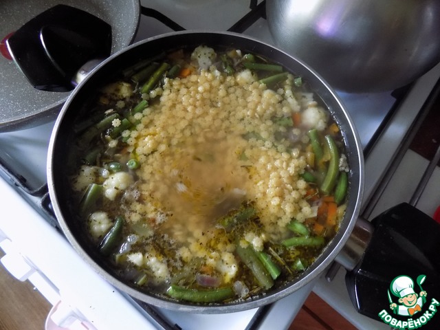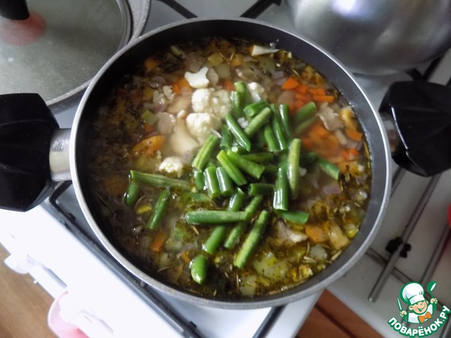 Выкладываем в суп цветную капусту, фасоль. Варим 2 минуты. Эти овощи очень быстро варятся и нам опять не нужно, чтобы они разварились.