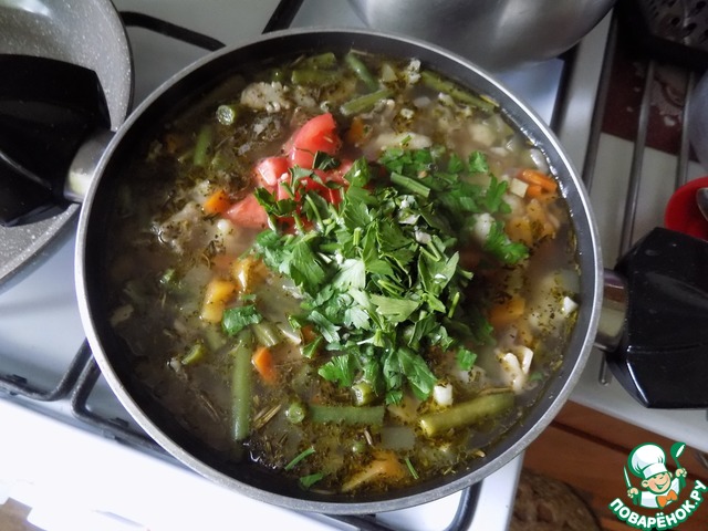 Выкладываем в готовый суп порезанный помидор и порубленную мелко петрушку. Доводим до кипения и снимаем с огня. Помидор и петрушку нам варить не нужно. Даём супу настояться немного.