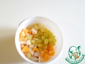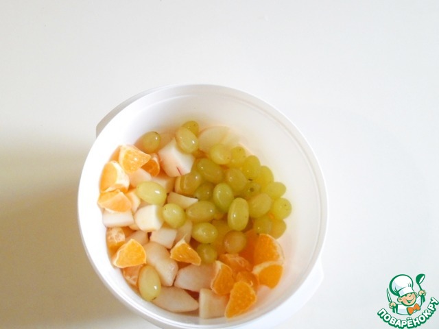 Фрукты помыть, очистить, нарезать на крупные произвольные кусочки. Виноград обобрать с кисти. Смесь фруктов сбрызнуть 1 ст. л. сока лимона.