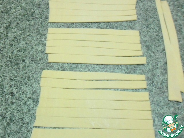 Раскатала в длинный пласт и нарезала на ленточки (что-то меня на ленточки последнее время тянет, уж не внучка ли намечается?...) -