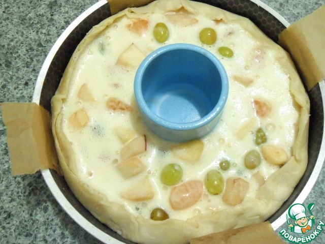 Залить фрукты яично-сметанной смесью. Края теста слегка загнуть во внутрь.