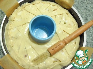 В центр поставить на тесто жаростойкий стакан или металлическую форму. Здесь керамическая формочка для запекания.