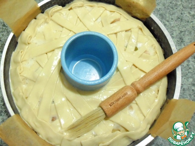 Одну часть теста раскатать в тонкий пласт, выложить им форму, которую предварительно смазать маслом, припудрить мукой. Я для подстраховки выложила две полоски пергамента. Диаметр формы 20 см.