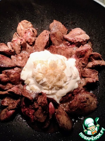 Продукты подготовили, овощи помыли, печень разморозили. И быстренько приступаем) Печень обсушили полотенцем, порезали крупными кусочками и обжариваем в раскаленном масле по 3-4 минутки с каждой стороны. В это время нарубим мелко чеснок и порежем яблоки крупными дольками. В печень добавим половину чеснока и сметану, все перемещаем, закроем крышкой, ещё минутка и убираем с огня.