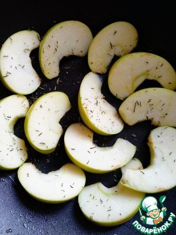 Разогрейте на чистой сковороде сливочное масло, добавьте дольки яблока, тимьян и чеснок и слегка обжарьте яблоки не более 5 минут. В это время нарежьте баклажан тоненькими колечками. Баклажан также обжарим до мягкости.