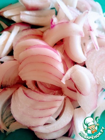 Помидоры режем дольками, лук соломкой, рвем руками листья салата. Смешиваем оливковое масло и бальзамический крем.
