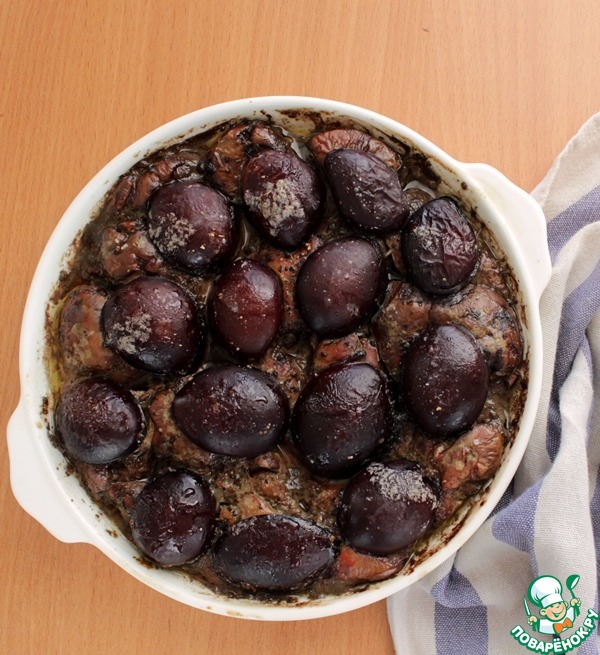 Поставить в хорошо разогретую духовку на 180* на 50-60 мин. Хорошо, если при запекании слива "сморщится", она отдаст больше сока печени, мне попалась слива твердая, морщиности не получилось.