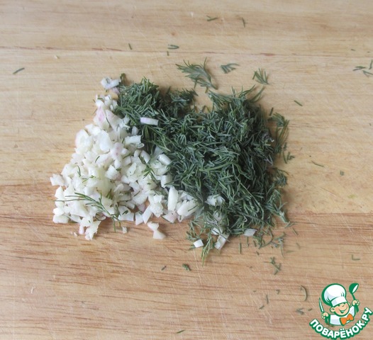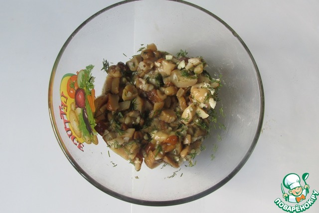 Одну часть грибов режем на небольшие кусочки, добавляем укроп и чеснок, перемешиваем