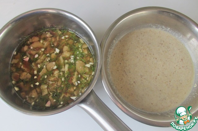 В одну часть добавляем грибы с чесноком и укропом, в другую - сливочно-грибную массу.