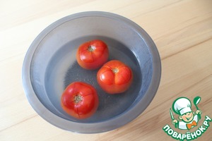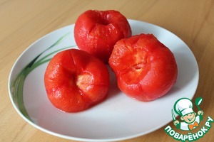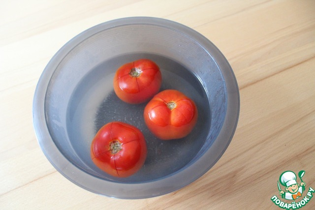 Помидор очистить от кожуры. Для этого его нужно надрезать сверху, залить кипятком, оставить на пару минут. Затем ополоснуть в холодной воде. Теперь легко снимается кожура. -