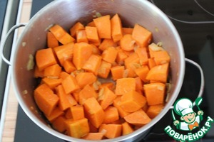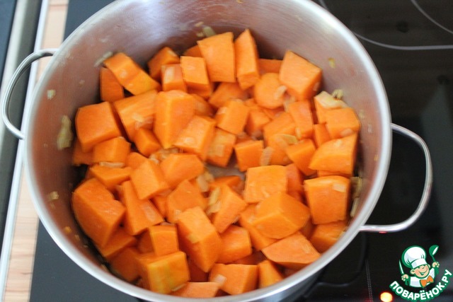 В большой кастрюле пожарить лук в растительном масле до золотистого цвета, добавить тыкву. Жарить 5 минут, постоянно помешивая.