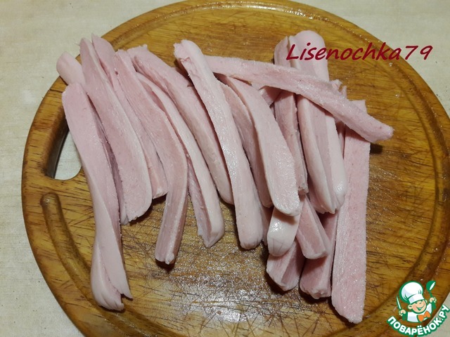 Берем сосиски, разрезаем их на 6 частей вдоль.