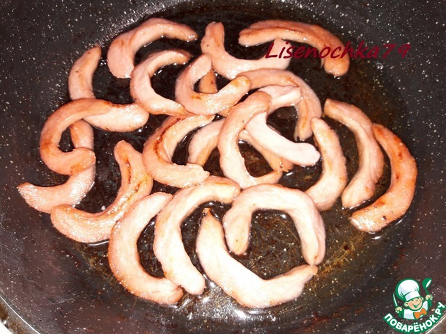 Обжариваем их на небольшом количестве растительного масла, во время жарки сосиски подрумяниваются и заворачиваются колечком. Только мешайте, чтобы все сосиски свернулись.