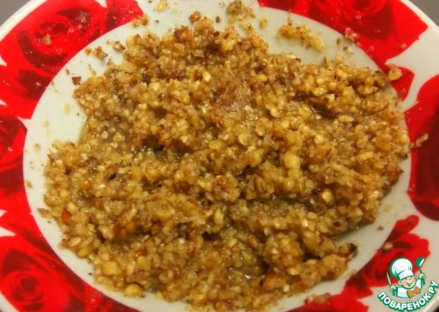 Прогреть на огне, пока сахар не растворится. Смешать сироп с измельченными орехами. Начинку остудить. -