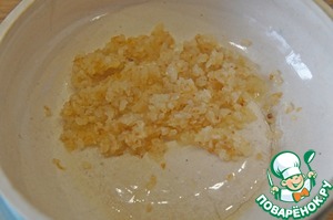 На растительном масле слегка обжарить лук, до прозрачности, выложить в небольшую, желательно, широкую, кастрюлю. Накрыть крышкой и держать в теплом месте.