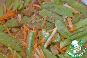 Добавить к нему лопатки гороха и все вместе еще немного обжарить.