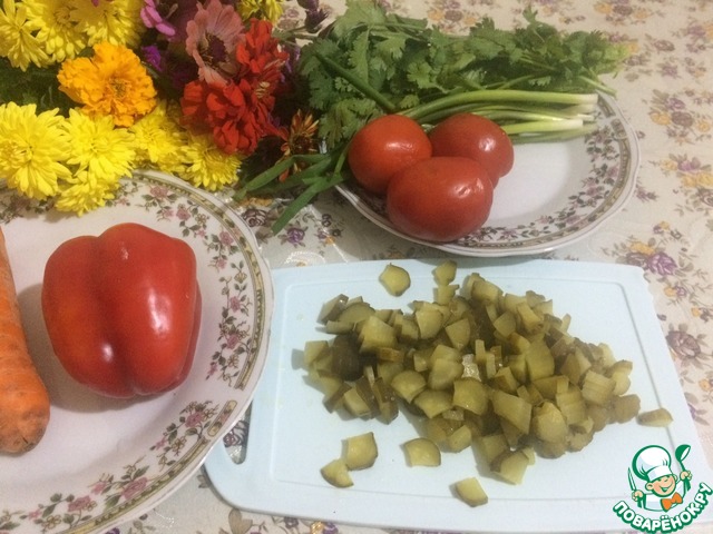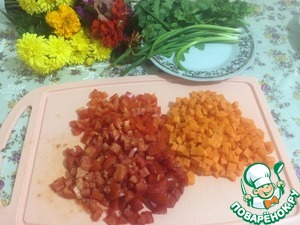 • Все наши овощи - помидоры, морковь, болгарский перец - нарезаем небольшими кусочками.