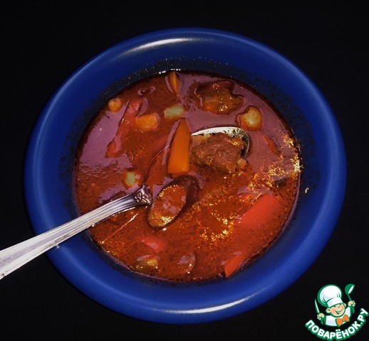 Очень рада была познакомиться с этим рецептом у Анны Пустынниковой, за что выражаю ей огромную благодарность. Есть несколько супов в моем рационе, которые я очень люблю и приятно, что их список пополнился. Ароматный, насыщенный, яркий! Трюк с обжариванием мяса (я брала телятину) в красном вине приводит к тому, что оно выглядит, как мясо трофейного дикого зверя. А аромат! Мммм... Копченая паприка! Ее много! Она придает этот невероятный аромат и такой оптимистичный цвет! Да, еще... А брусника! Представляете: набираете ложку горячего супа и тут взрыв - вы раскусили эту дикую ягоду. Новый оттенок вкуса в ту же секунду. Игра вкусов, текстур, ароматов - вот, что такое этот насыщенный согревающий суп! Пусть не пугает вас такой длинный состав. Он прост в приготовлении.