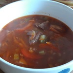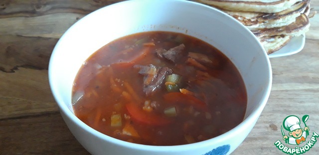 Ну очень вкусный супец!!! Делала всё по рецепту с говядиной, вместо острого перца положила перечную пасту янним от Демоники и брусники нет. Муж подал идею, добавить маринованый огурчик, он хорошо вписался в суп . Аллочка, огромное спасибо за рецепт, нам очень -очень понравился суп !!!