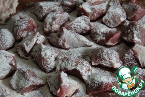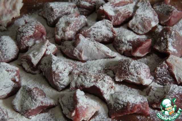 • Мясо вымыть, очистить от пленок, нарезать кусочками, обвалять в муке.