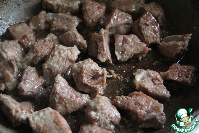 • Обжарить на растительном масле в глубоком сотейнике, желательно в один слой, чтобы мясо хорошо подрумянилось.