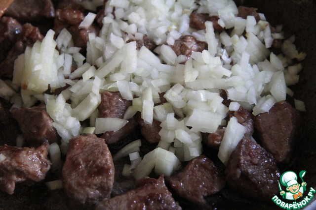 • Нарезать лук мелкими кубиками, добавить к мясу, немного потушить.