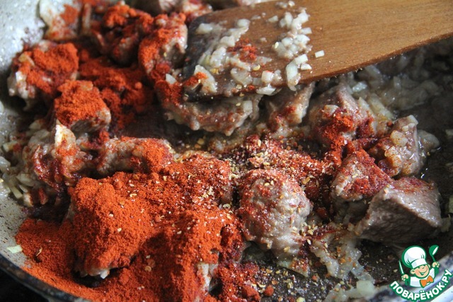 • Присыпать паприкой и красным перцем, помешать.