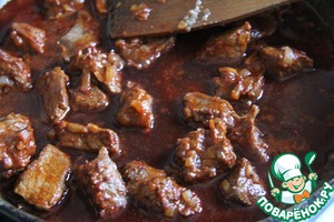 • Добавить бульон (1,5 - 2 литра, чтобы он покрывал мясо) и сахар, тушить на слабом огне до готовности мяса (1-1,5 часа). В середине процесса добавить кусочки моркови.