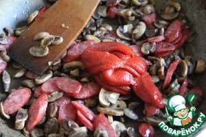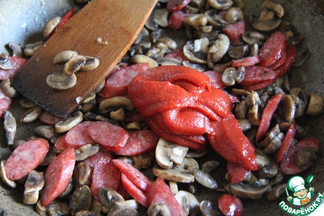 • Слегка обжарить грибы и колбаски, добавить томатную пасту и обжарить с ней пару минут.