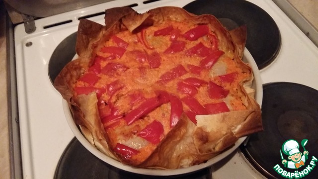 Форму смазать маслом, выложить лист лаваша, промазать его тонко маслом - и так сделать с остальными листами лаваша. Края лаваша не должны сильно выступать за форму, подровнять их и смочить кисточкой водой, чтобы не подгорели при запекании.
