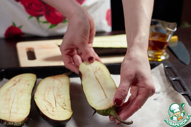 Вымоченные баклажаны надрезать вдоль и поперек. Так они будут легче резаться на тарелке и будет удобнее есть. Полейте половиной оливкового масла.