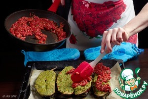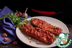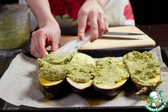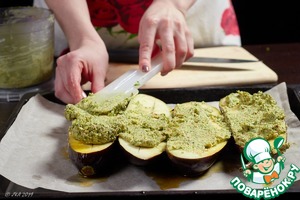 Смазать баклажаны масляно -ореховой пастой и отправить в духовку на 15 минут. Температура 200С