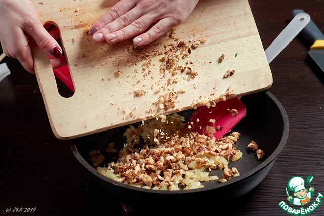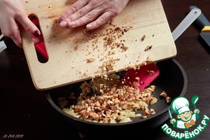 Поджарьте их до золотистости на оставшемся масле с половиной грецких орехов