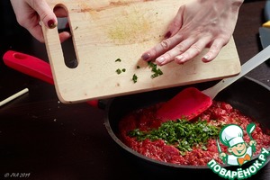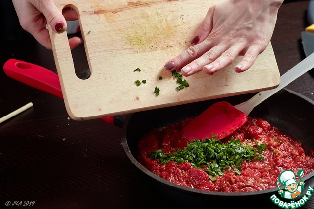 Выложите мякоть помидоров. Доведите до вкуса солью и сахаром, добавьте хмели-сунели, зелень и кориандр. Дайте покипеть пару минут.