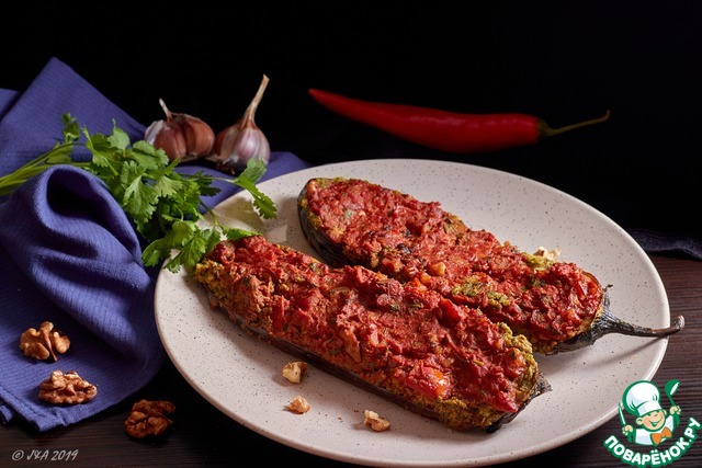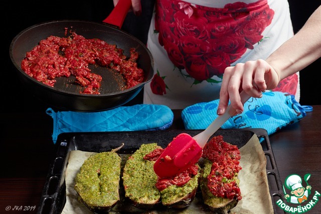 Запеченные баклажаны полить томатным соусом и отправить допекаться еще на 15 мин.
