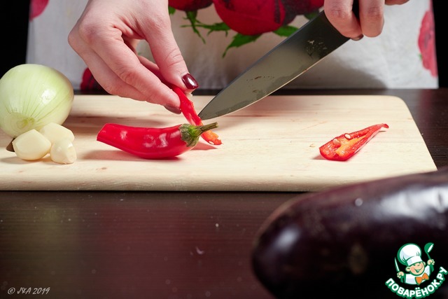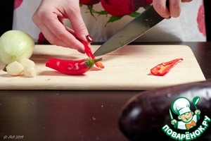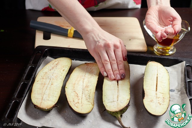 Баклажаны нарезать вдоль, крепко посолить, вымочить в холодной воде 20 мин., чтобы избавиться от горечи.