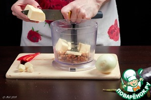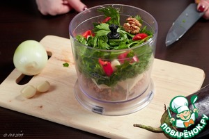 К половине грецких орехов добавить холодное масло, половину петрушки и кинзы