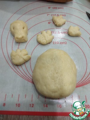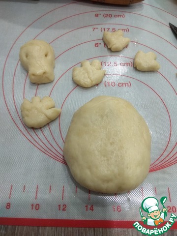Делим тесто на 8 равных частей. Пока корпим над одной зверюшкой, накрыть остальные кусочки, чтобы не заветрились. Делим наш шарик на две части - примерно 1/3 и 2/3. Большую часть раскатываем, выкладываем начинку, формируем пирожок-туловище. -